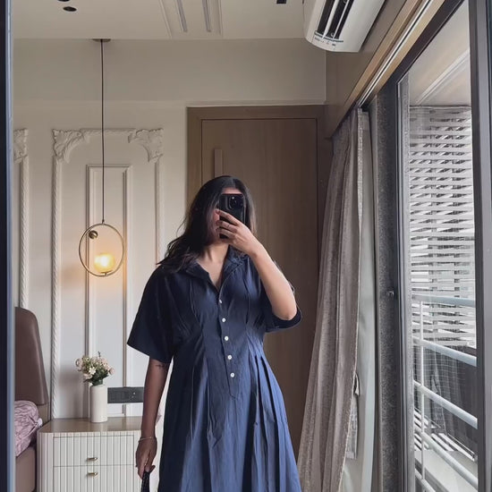 This dress features a V-shaped front opening with a button closure and a standard collar, enhancing its professional appearance. Additionally, box pleats adorn both the front and back of the waist.