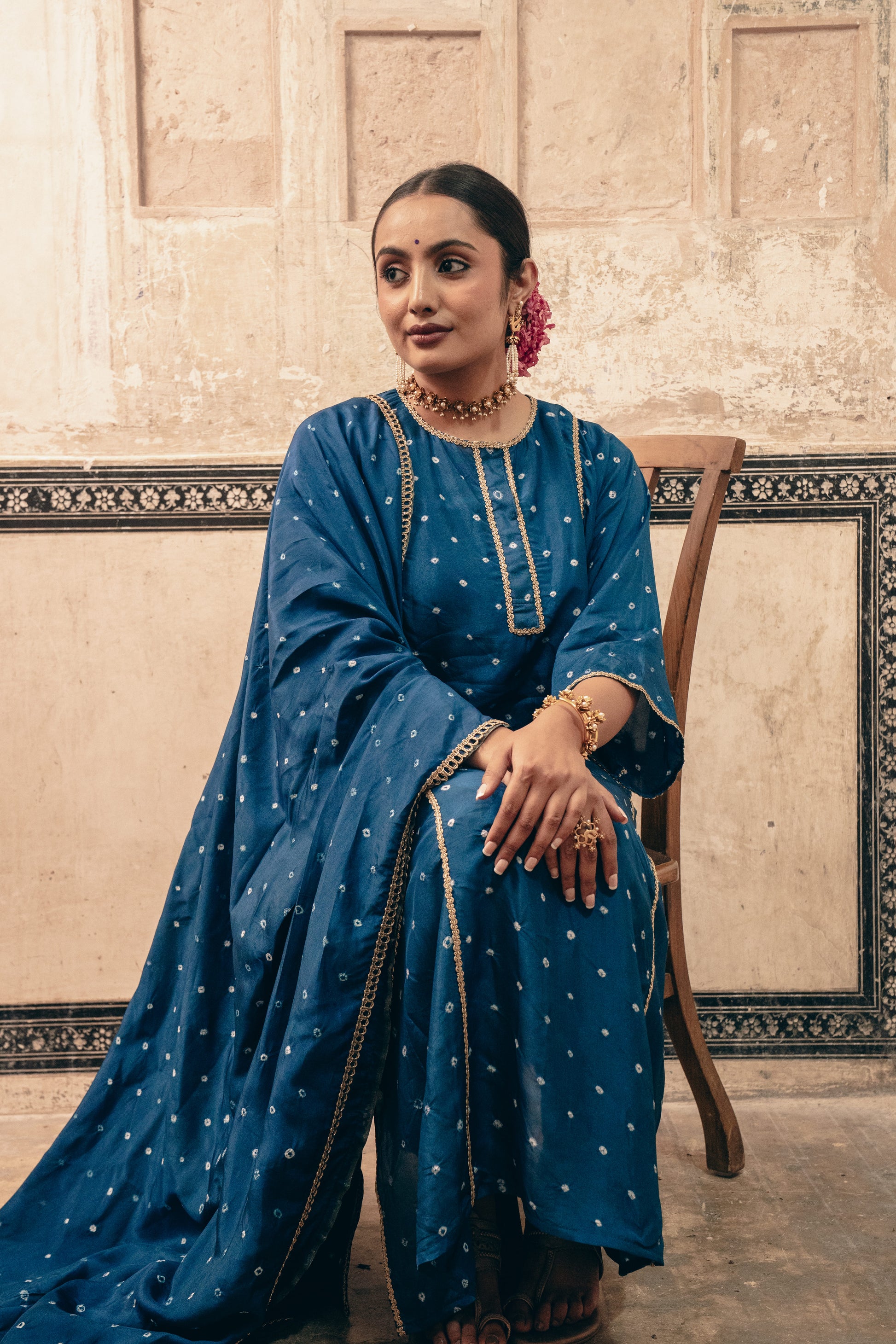 PEACOCK BLUE BANDHEJ KURTA SET IN UPADA SILK